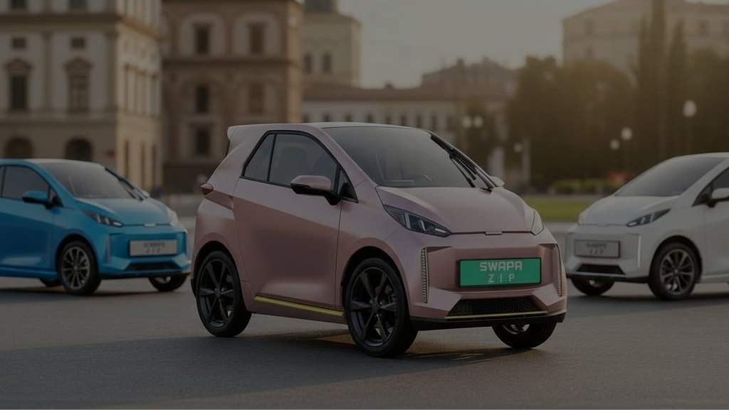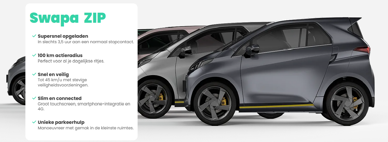 Maak kennis met de SWAPA ZIP: een elektrische tweezitter die perfect is voor het drukke stadsleven. Met een lengte van slechts 2,52 meter en een breedte van 1,2 meter navigeer je moeiteloos door smalle straatjes en vind je altijd een parkeerplek.